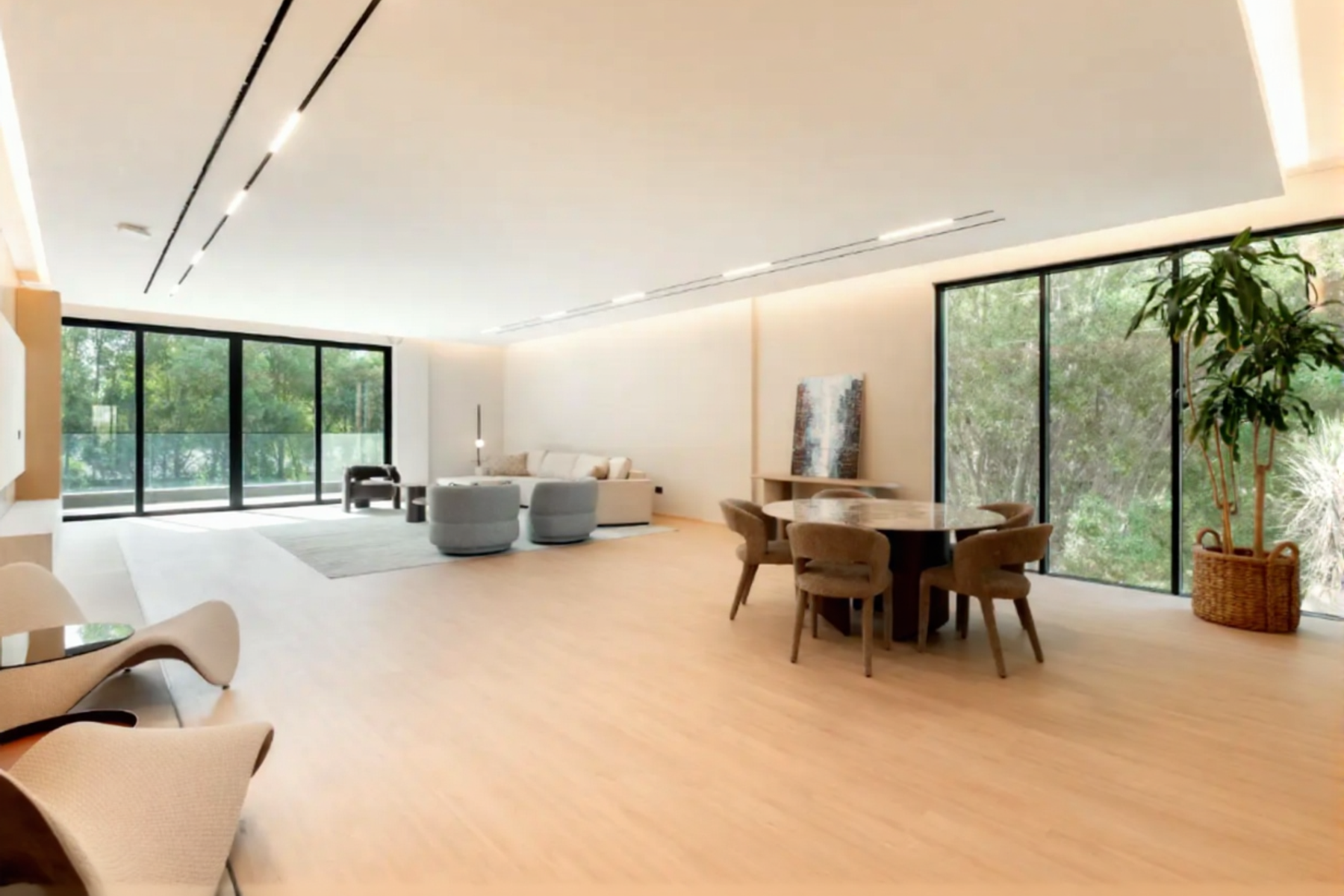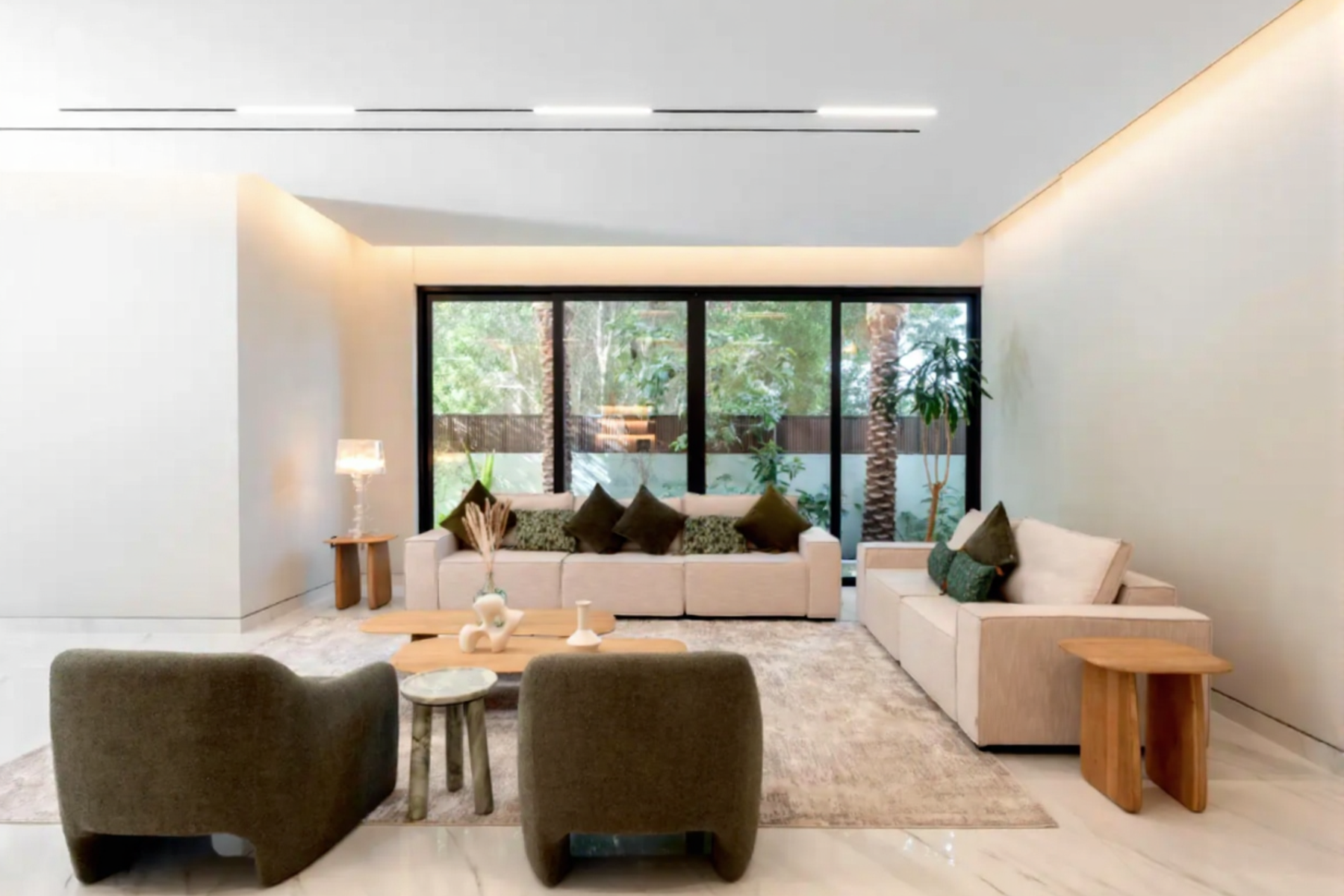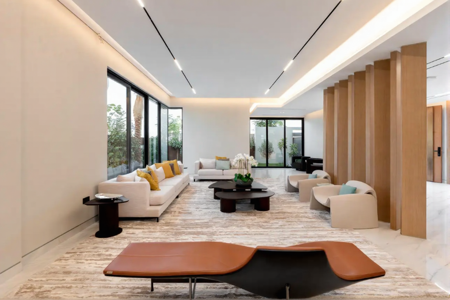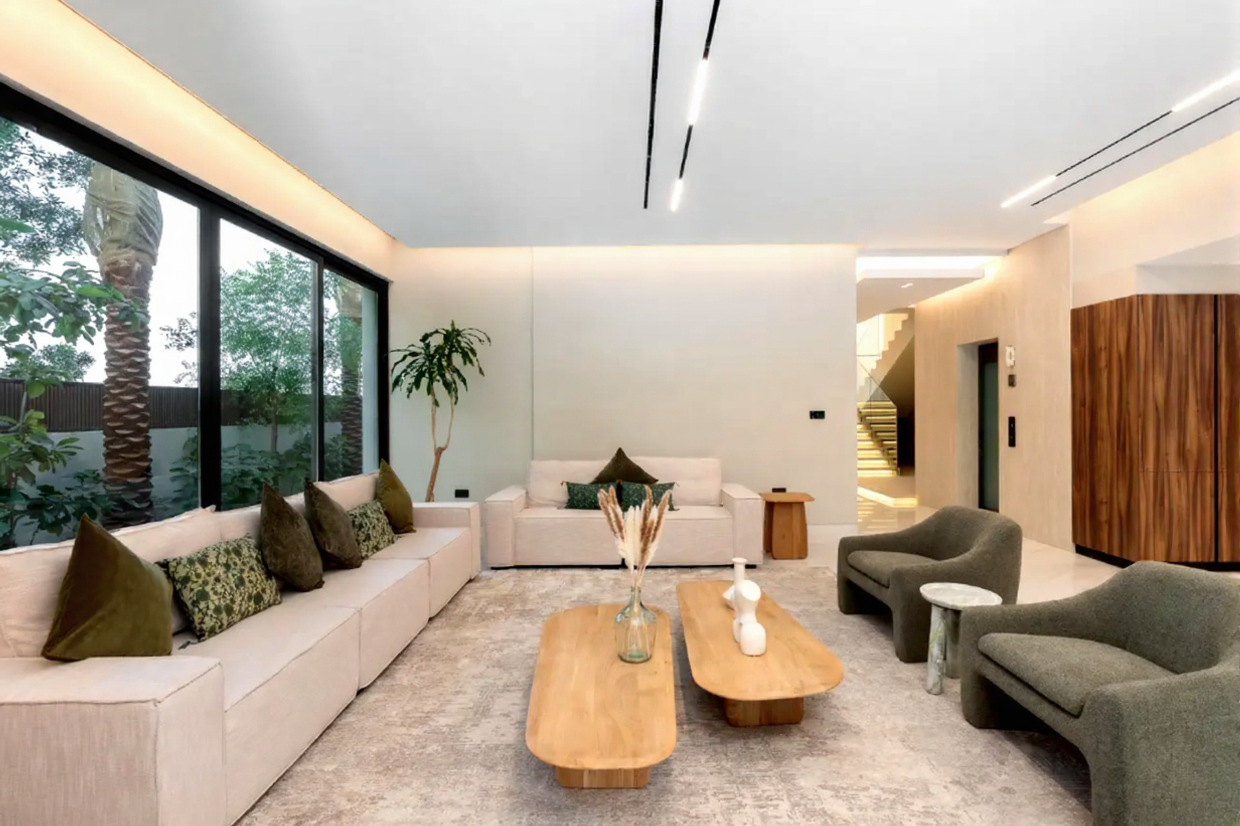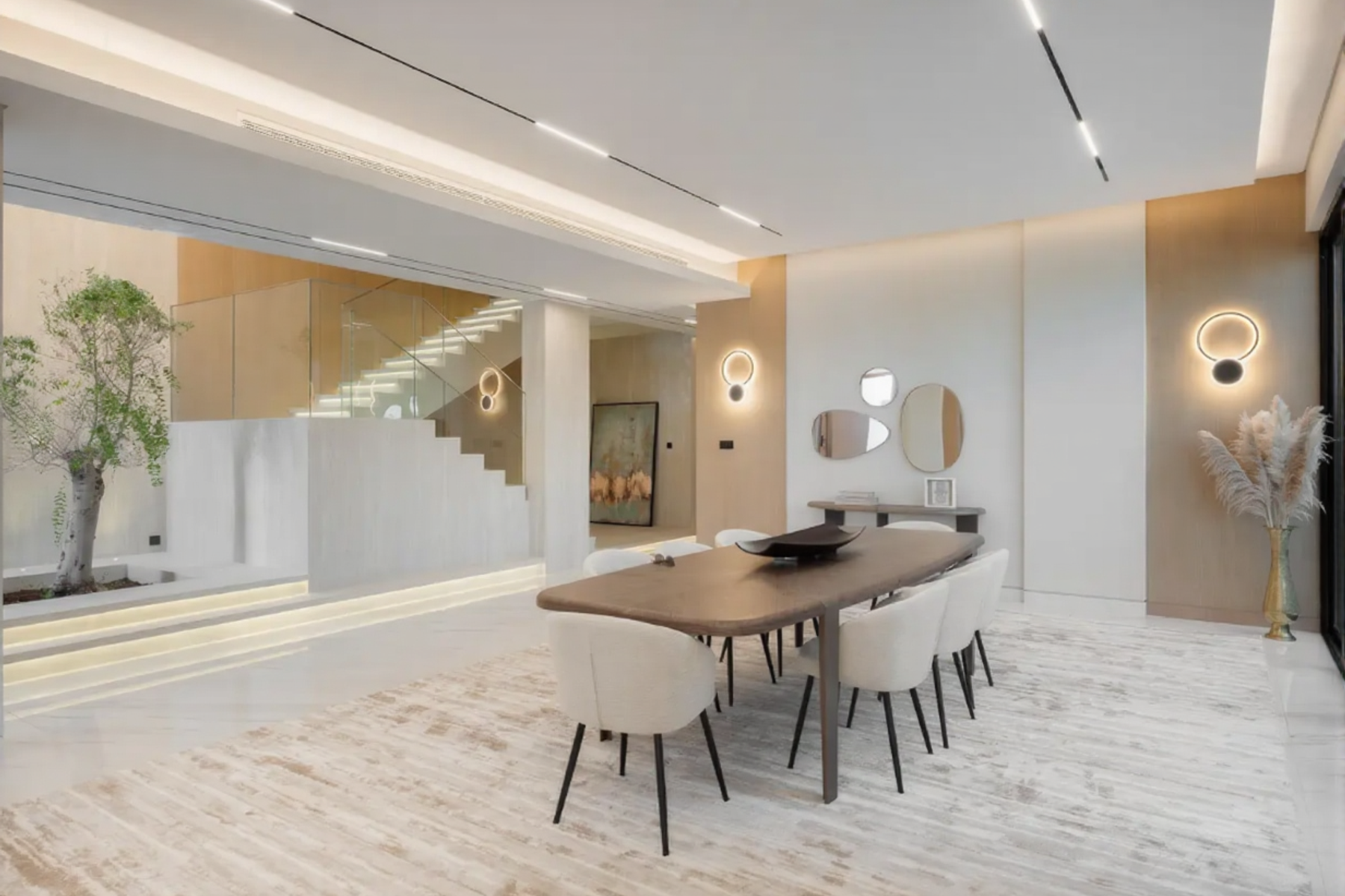 Интерьеры, залитые естественным светом, отличаются элегантными современными линиями, теплыми деревянными акцентами и высококачественной отделкой. Открытая планировка создает плавный переход между жилыми зонами и дополняется двумя полностью оборудованными кухнями. Практичные удобства включают комнаты для прислуги и водителя, а также интеллектуальную систему домашней автоматизации для повышения комфорта и безопасности.