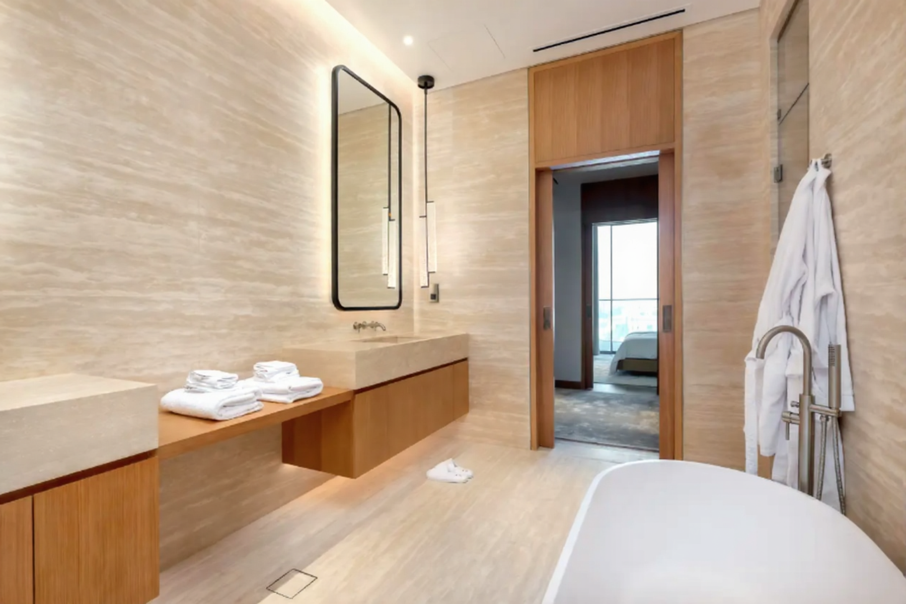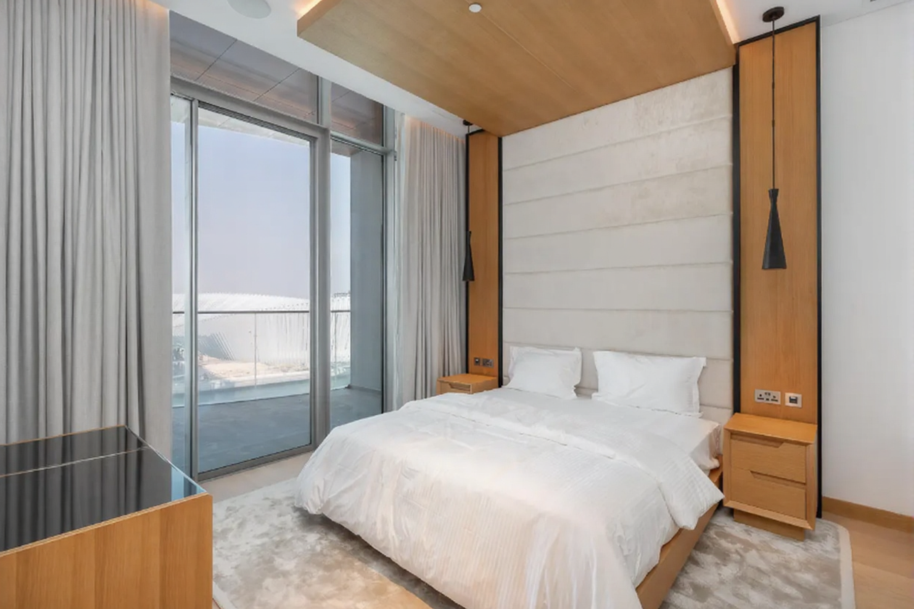 Занимая половину этажа, резиденция окружена панорамными окнами от пола до потолка, из которых открывается вид на канал и горизонт Дубая. Интерьеры прекрасно оформлены мебелью, изготовленной на заказ компаниями Cipriani и Minotti, и дополнены светильниками Holly Hunt. Светлая гостиная и столовая плавно переходят в открытую кухню, оборудованную мебелью Gaggenau, с винным баром, а также в отдельную служебную кухню и прачечную.